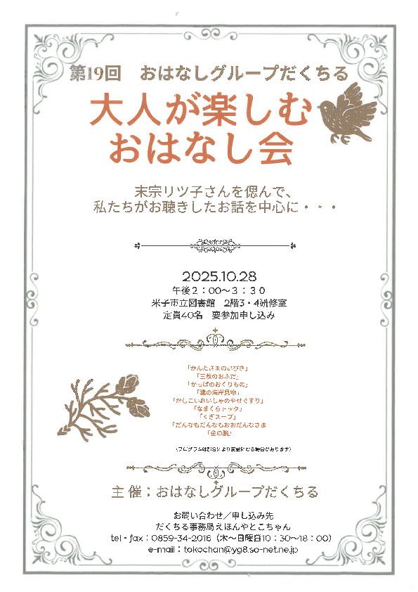 申込み・お問合せ先:だくちる事務局えほんやとこちゃん
