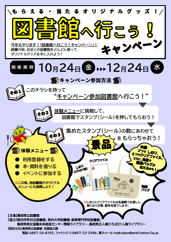 鳥取県立図書館と市町村立図書館などと共同で、「図書館へ行こう!キャンペーン~もらえる・当たるオリジナルグッズ!~」を実施します。
