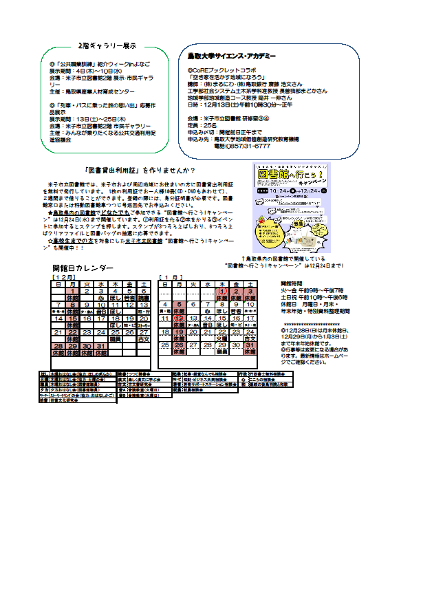 ◎年末年始休館日 12月28日(日)から1月3日(土)までです。