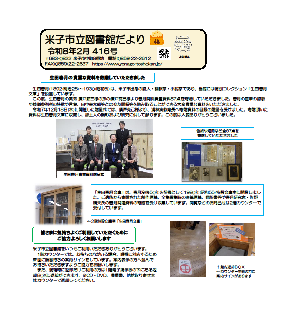 米子市立図書館には、2階の特設文庫に「生田春月文庫」を開設しています。生田春月文庫は春月没後50年を契機として1980年(昭和55)以降、ご遺族から寄贈された創作原稿、全集編集時の直筆原稿、翻訳書等や春月研究家・佐野晴夫氏の春月関連資料の寄贈を受け収集したものとなっています。