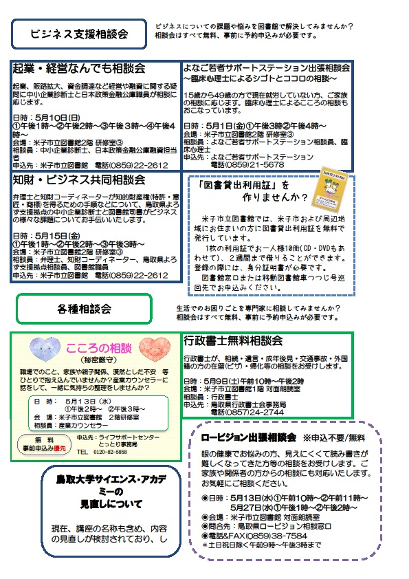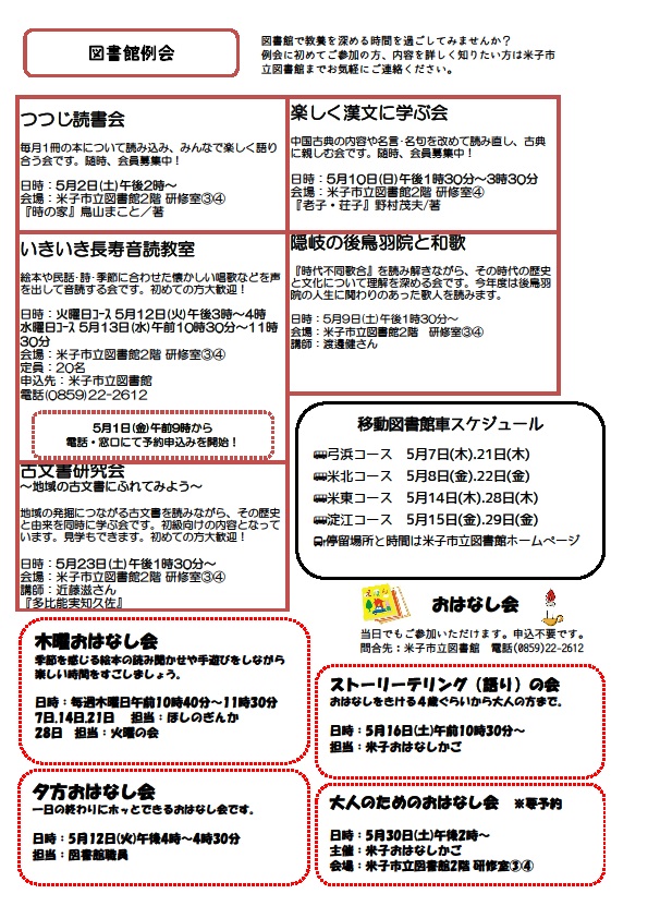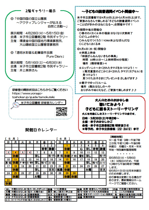 米子市立図書館ではゴールデンウイークや母の日にあわせたイベントを開催します